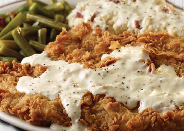 Nothin’ more country than a big breaded steak, fried golden and smothered with rich gravy.