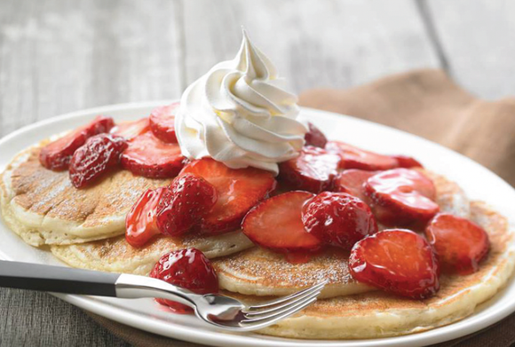 Stack of our pancakes hot from griddle topped with your choice of: strawberries, bananas, blueberries, peaches, apples, cherries, pecans, or chocolate chips. Add an extra topping for 1.29